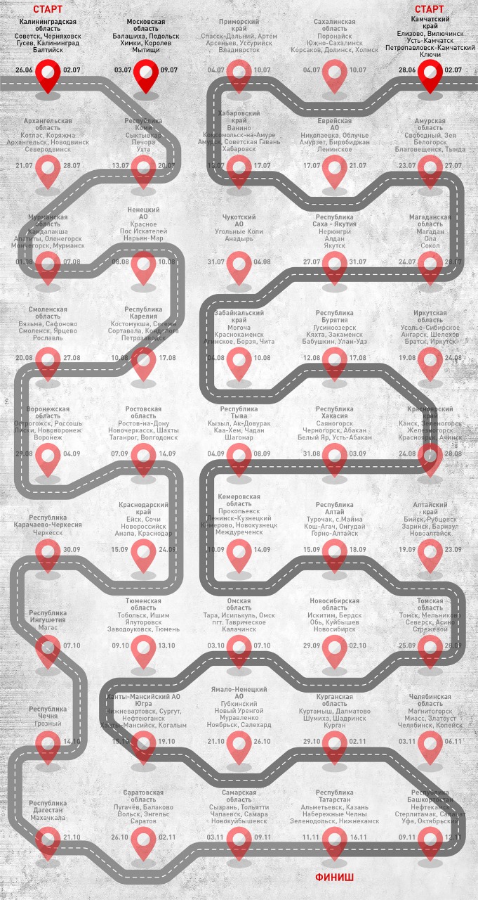 26 июня две команды экспедиции одновременно стартуют из Камчатки и Калининграда, чтобы проследовать навстречу друг другу через всю страну и встретиться 16 ноября в Казани на закрытии акции. Ставшие узнаваемыми мобильные пункты тестирования (МПТ) - брендированные автомобили ГАЗ белого цвета с широкой красной лентой и надписью «Тест на ВИЧ: Экспедиция» на бортах в этом году проедут около 200 городов в 45 регионах России, включая регионы Крайнего Севера и Северного Кавказа. .
